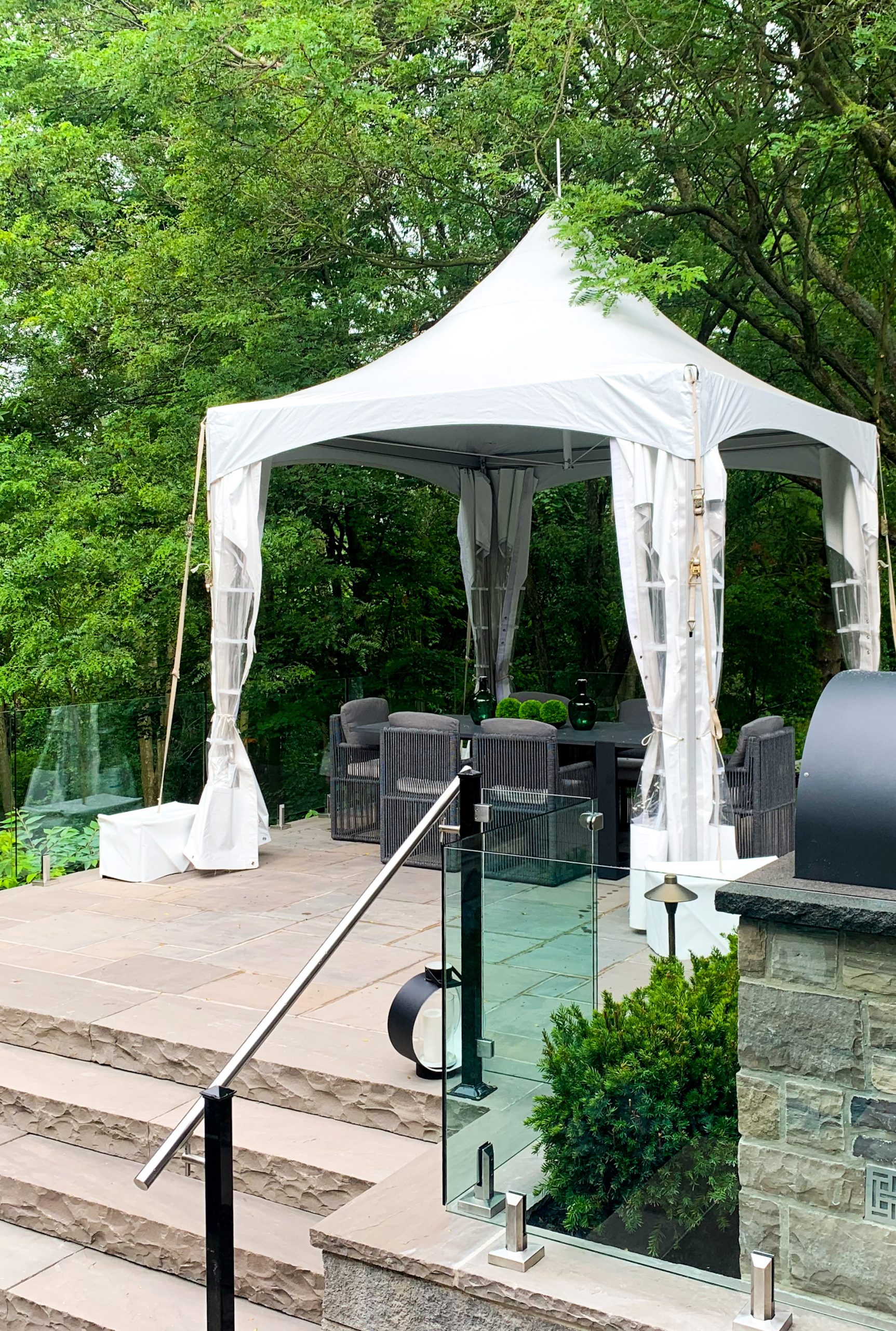 The High-Peak Tent can be installed on any surface including grass, asphalt, patio stones and deck. Depending on the surface, our crews may secure the tent with spikes, concrete blocks, or a combination of both.